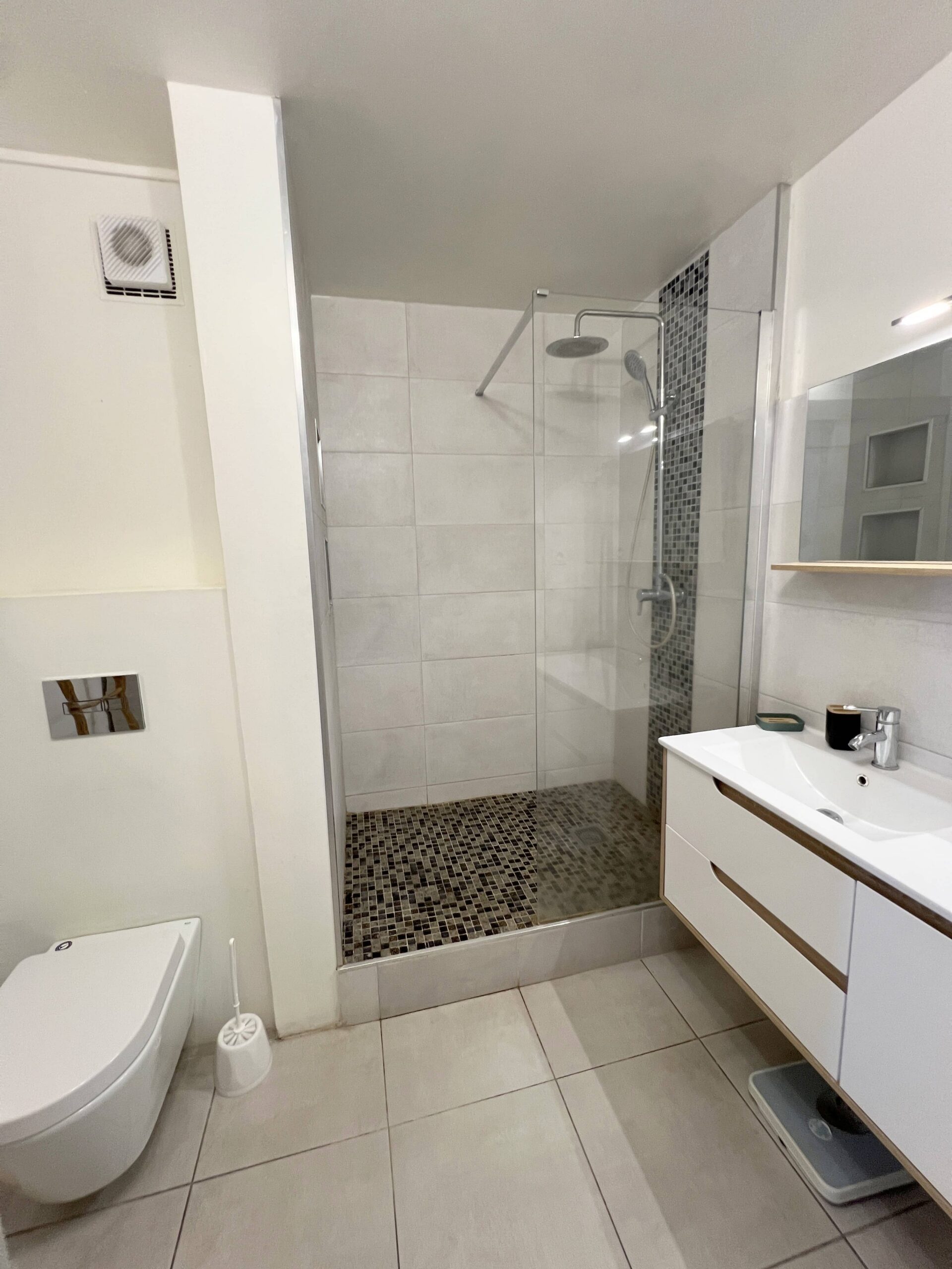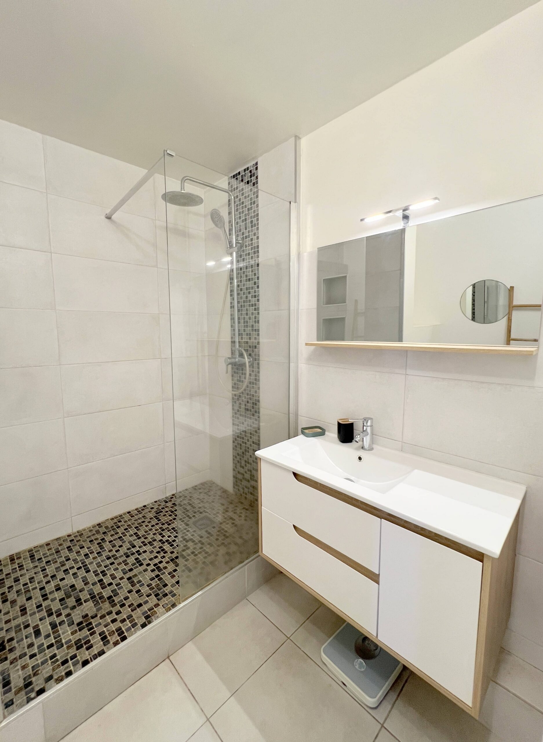 Salle de douche : Sèche-cheveux, Produits de nettoyage, grande douche.
