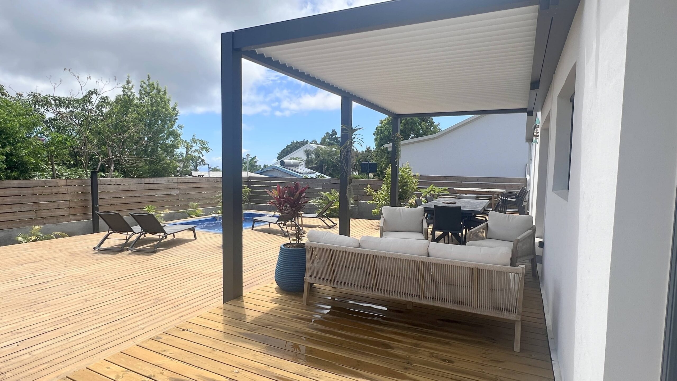 Extérieur : Mobilier d’extérieur, Espace repas en plein air sous verranda bio-climatique, Ustensiles de barbecue, Barbecue, Transats, Douche extérieure.