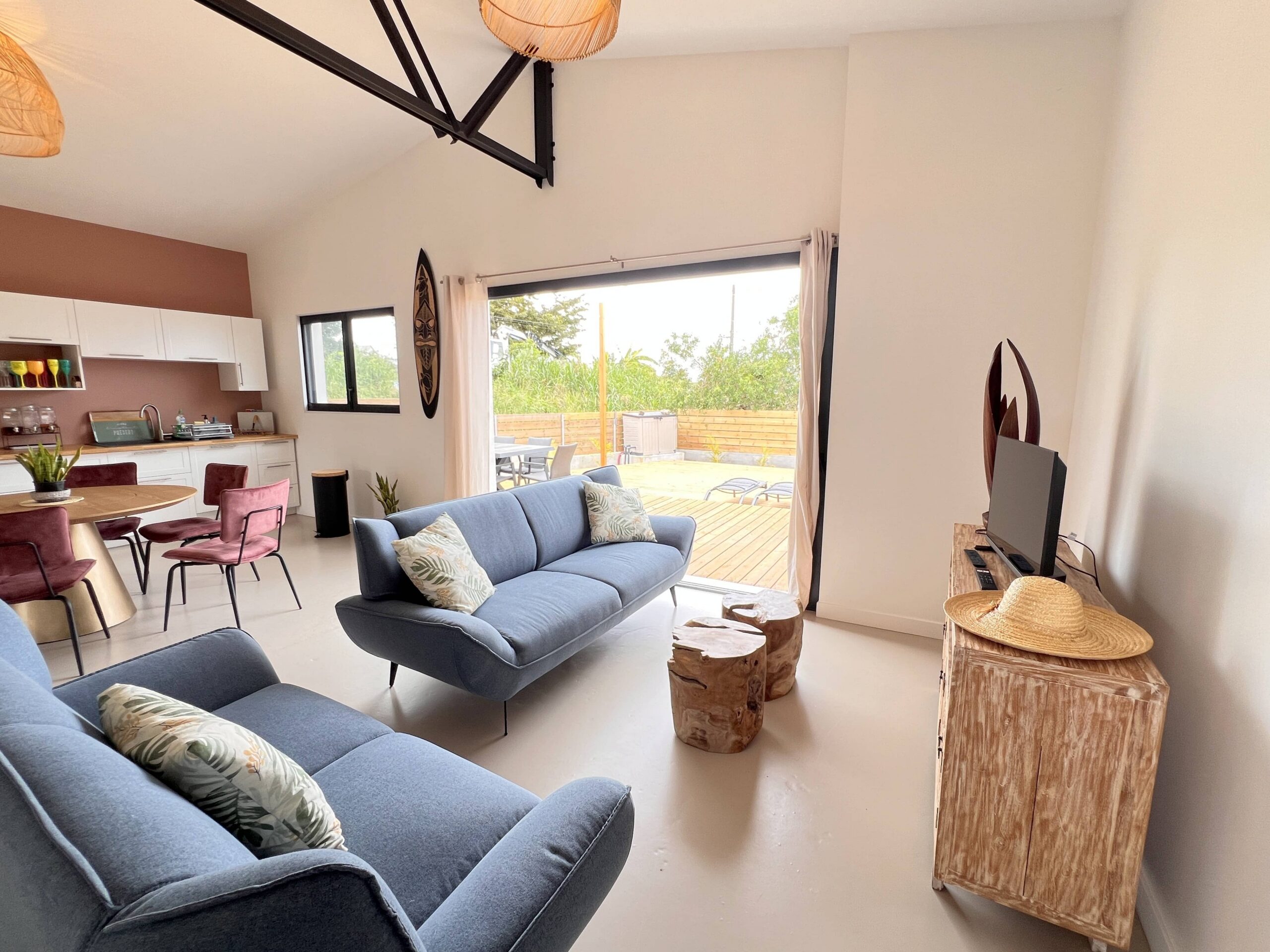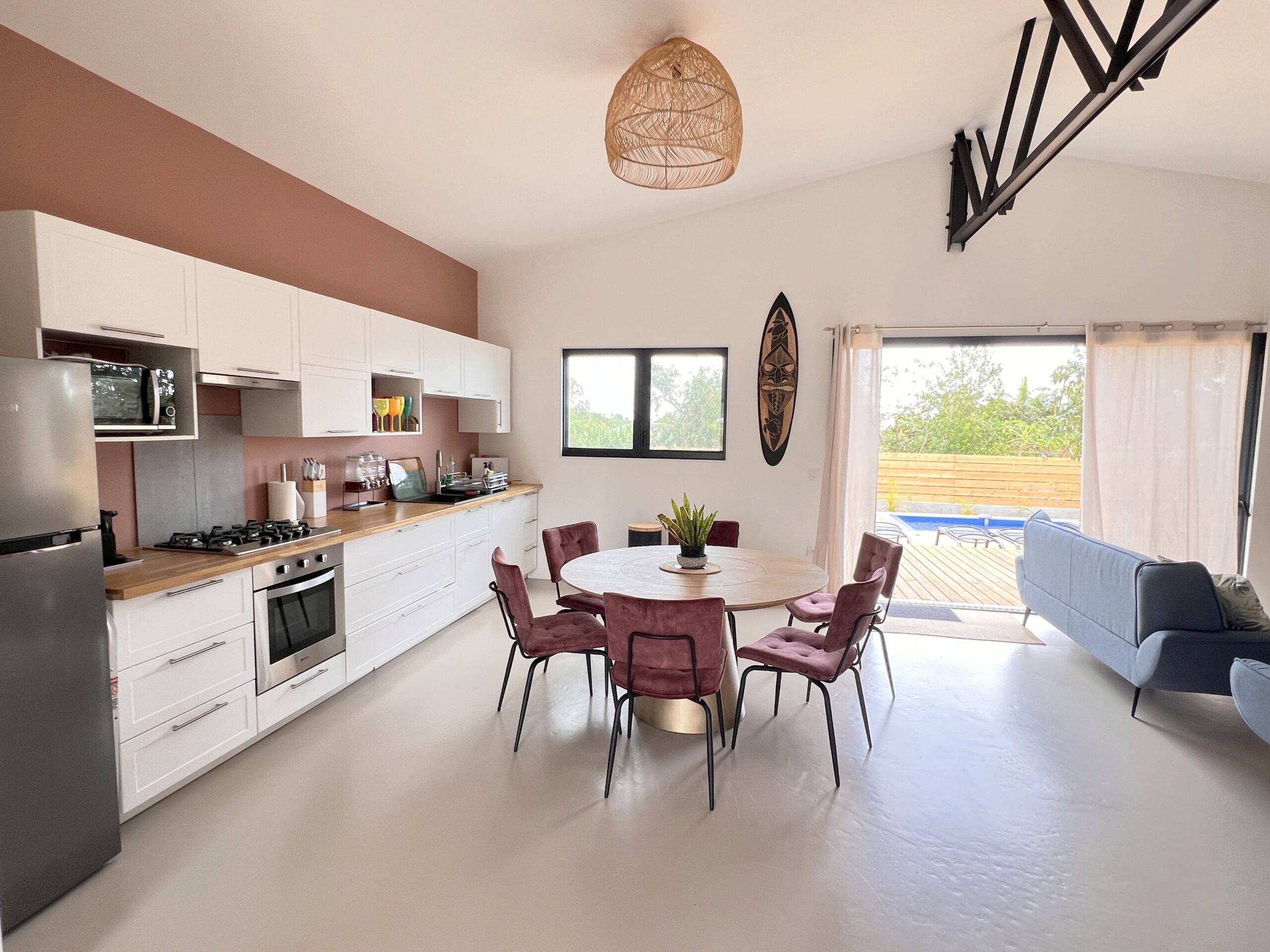 Villa La Ka’z à nou, classée****, havre de paix sur la commune de Saint-Gilles, proche commerces et 10 mn en voiture environ du Lagon. Elle dispose de sa propre piscine privative. Pièce de vie de plus de 40 m² avec cuisine ouverte, 3 chambres (1 lit en 180, 2 lits en 160) dont une en suite parentale avec sa salle de douche, 2ème salle de douche, 2 WC séparés. Grande terrasse ombragée. Idéalement située à Saint-Gilles-les-Hauts, à deux pas du musée de Villèle et de L’Eperon, à 45 mn de l’aéroport et 10 mn du lagon. Parking privé.